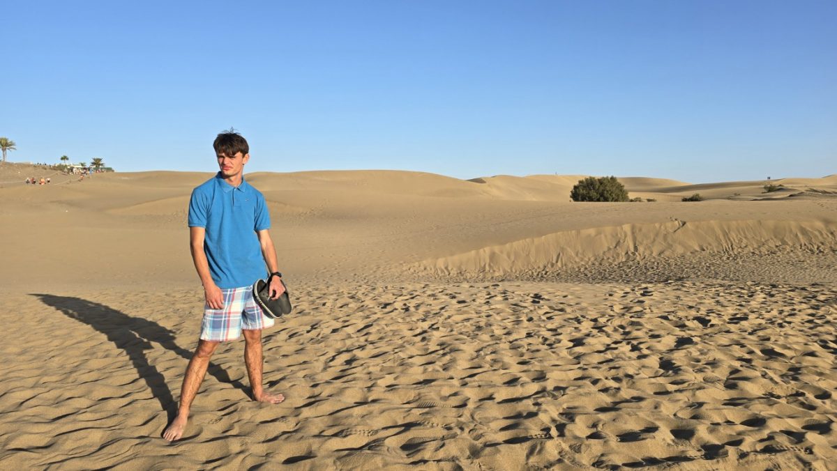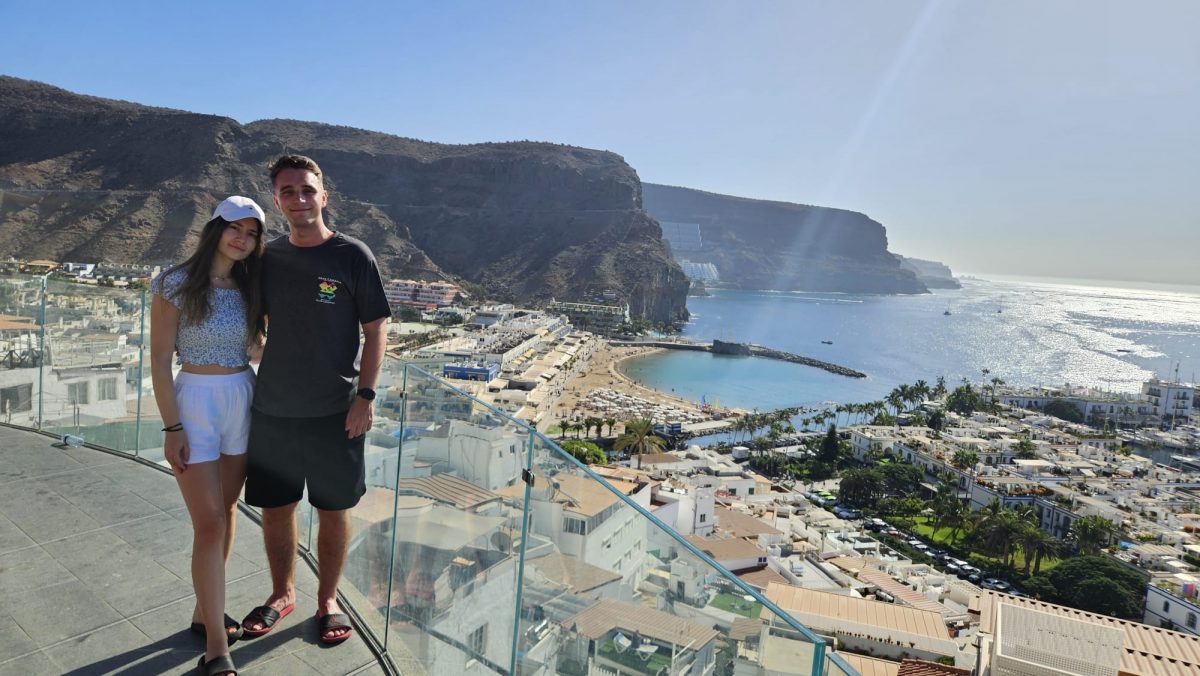 Krótko przed naszym wyjazdem , Kamil dostał wiadomość, że ich walizka zostanie za pół godziny dostarczona, więc czekaliśmy. Po jej odbiorze ruszyliśmy w drogę do Playa Anfi del Mar– plaży na Gran Canarii, znana z białego piasku sprowadzonego z Karaibów i spokojnej, turkusowej wody.Wyróżnia ją zatoka w kształcie serca, która tworzy osłonięte, spokojne kąpielisko idealne dla rodzin. Dostępne są tam liczne atrakcje, takie jak sporty wodne, restauracje i promenada.