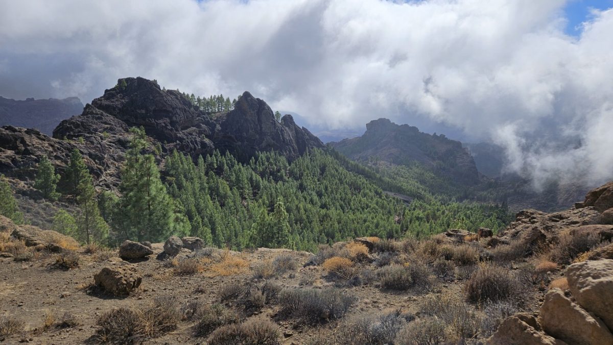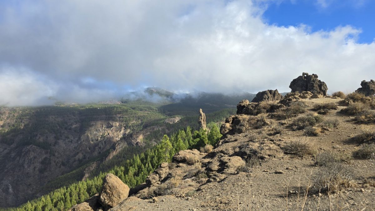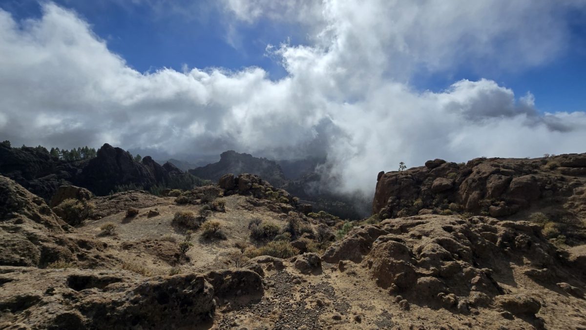 W drodze powrotnej jechaliśmy we mgle, ciesząc się , ze mogliśmy mieć widok z Roque Nublo. Jechaliśmy w stronę Mirador del Pico de los Pozos de las Nieves  -najwyższego punktu widokowego na Gran Canarii, położony w samym sercu wyspy, na wysokości 1949 metrów. Z tego punktu roztacza się  widok na rozległy obszar wyspy, wpisany na listę rezerwatów biosfery UNESCO, z niezliczonymi głębokimi wąwozami i ostrymi grzbietami, porośniętymi roślinnością i zwieńczonymi tajemniczo ukształtowanymi szczytami wulkanicznymi.Obok parkingu znajduje się kamienny półkole, idealnie zorientowane na zachód. To platforma widokowa, prosta i pozbawiona przeszkód, które mogłyby zasłaniać piękny zachód słońca. W przeciwieństwie do innych miejsc, pochmurne dni oferują najlepsze widoki w Las Nieves – widać, że Teneryfa i Gran Canaria zdają się unosić na morzu chmur. Nam nie było to dane, ale za to czekała nam inna niespodzianka. Możliwość podziwiania zjawiska Widmo Brockenu